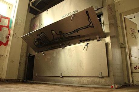 Moi je m’aventurai dans l’aile droite. Il s’agissait de petits laboratoires largement vandalisés et graffés. Je revenais sur mes pas pour rejoindre F et le convaincre de visiter directement le sous sol, là où je soupçonnais que l’on trouverait les salles de dissection et les frigo où les corps avait été entreposés. Effectivement tout ce que l’on pouvait espérer de glauque s’y trouvait. On se serait cru dans un film policier… Là encore F. passa du temps à photographier, captivé par l’ambiance. Je m’éloignait dans la grande salle où se trouvait autrefois les tiroirs à cadavres. La plupart avait disparu mais il en restait quelques uns que je n’aurai pour rien au monde ouvert de peur de faire une macabre découverte. Je me glissais près d’une porte ouverte qui laissait filtrer le soleil. La proximité avec la vie extérieure était rassurante, surtout quand nous entendions à intervalles réguliers des bruits suspects dans le bâtiment. Certainement de l’eau qui ruisselait le long d’une quelconque gouttière, ou bien le pas de revenants. Difficile à dire !